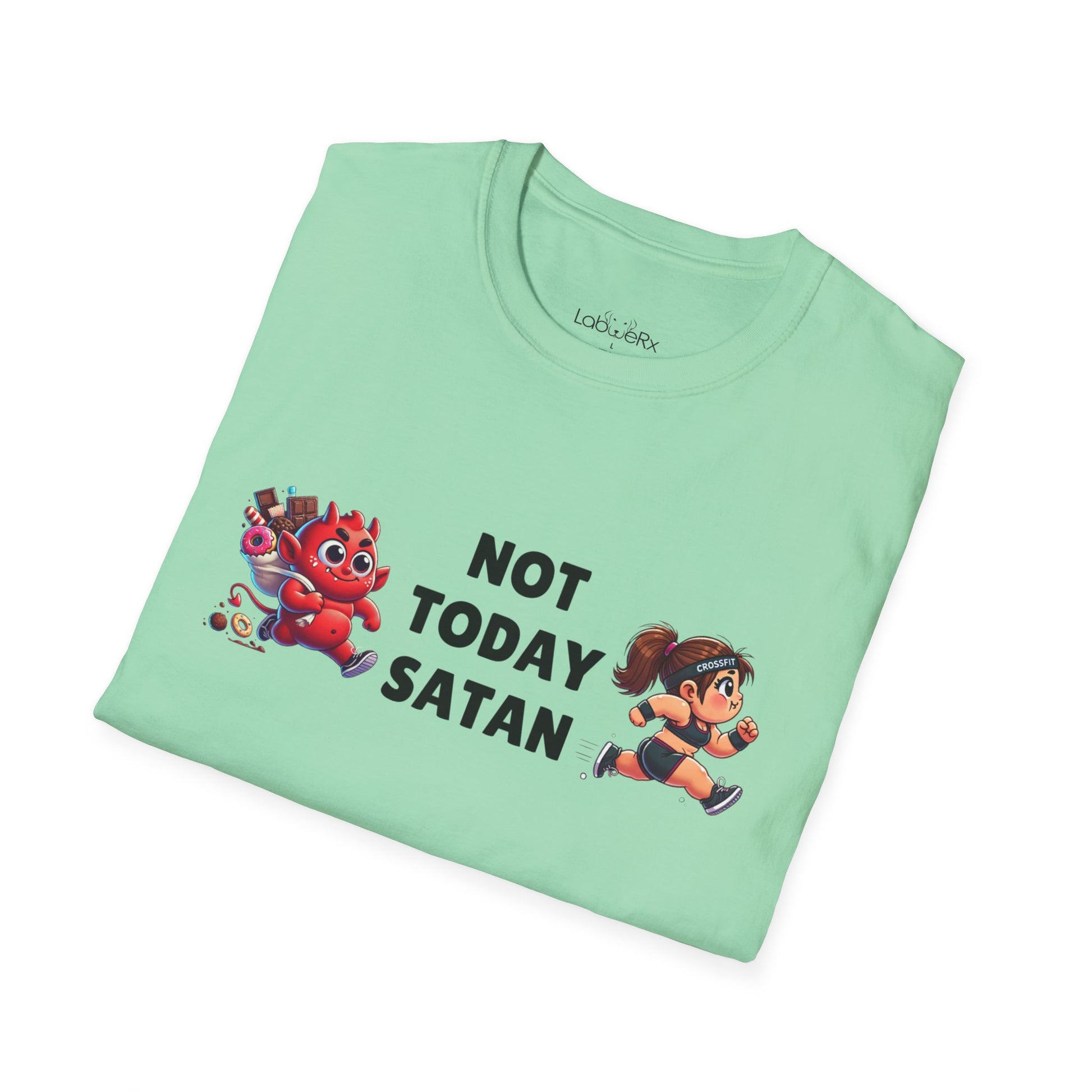 NOT TODAY SATAN (FEMALE) T-Shirt. The devil made me do it... is my excuse as I slaughter an entire box of Krispy Kreme glazed... Self-control is difficult which is why my body type is "works out, likes beer and tacos..." I blame the devil.